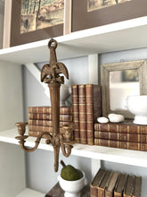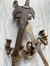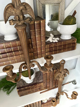 Regal + refined, this pair of vintage candle wall sconces channels the grandeur of early American neoclassicism. Cast in warm, aged brass-like colour, because they are actually wood - with a beautiful patina, each piece features a fluted torch form crowned by a stately eagle—wings outstretched in proud symmetry.