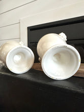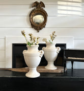 This pair of vintage ceramic urns features a classic silhouette with delicate scroll handles. Finished in a soft ivory glaze, they bring a refined, old-world charm to any shelf, mantle, or tabletop. Whether placed together or styled separately, these urns are versatile accents for traditional, cottage, or European-inspired interiors!