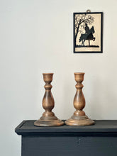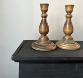 - round wood spindle style candlestick holders, a pair to hold classic taper candles