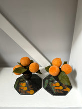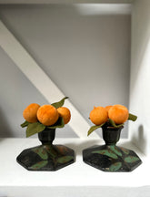 A Pair of Antique Candlestick Holders, made of porcelain and finished in a beautiful satin black with hand painted golden flowers and green leaves.