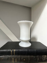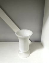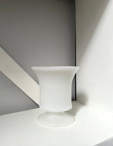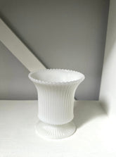 This elegant milk glass vase reflects the enduring appeal of classical forms reinterpreted for the modern home. Popular throughout the mid-20th century, ribbed milk glass offered a refined yet approachable alternative to cut crystal—celebrated for its soft opacity and sculptural presence.