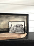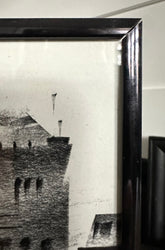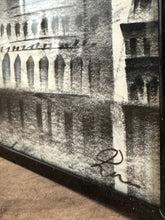 A black + white charcoal drawing of a cityscape on water. The style is somewhat impressionistic, with smudged lines and shading creating depth + texture. Set within a metal frame.