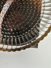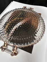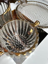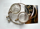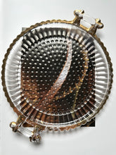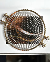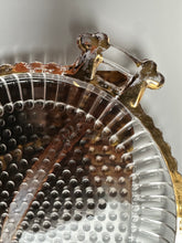 Beautiful glass oval tray made by the Jeannette Glass Co, named after the company's home Jeanette, Pennsylvania. A thumbprint pattern with a very worn gold detail around the rim. Scalloped style handles