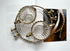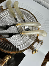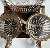 A fun set! Use all together or separate the tray out and use on a stack of books, or on your vanity with favourite perfumes! The rims and handles, now worn away in some areas, are decorated in real 22k gold. The pattern is 'National' Pattern by Jeanette Glass Company of Jeanette Pennsylvania.