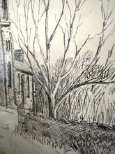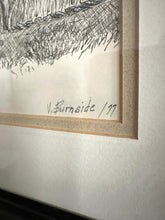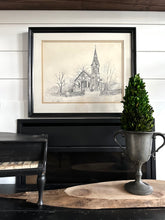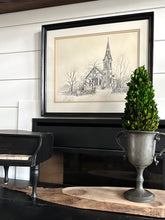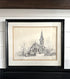 Vintage framed sketch of a church, artist signed bottom right, "V. Burnside '77"