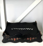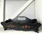 Vintage hand-painted wood divided tray with centre carrying handle. Created originally to carry cutlery from the kitchen to the dining table, but most definitely now a multi-purpose piece for stationery items, bathroom essentials or a fruit display. Lovely folk art floral detail and a scalloped edge.
