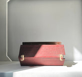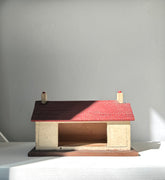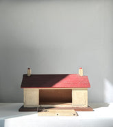 A sweet vintage toy train station house with a classic pitched red roof, twin chimneys (with interior fireplaces), and a mint green front door. Hand-painted details and textured windows remind us of a sweet innocence of mid-century playthings. A great piece for collectors or as a whimsical accent in any curated shelf or nursery display!