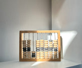 Dating back from the mid-20th century, this worn vintage wooden abacus features smooth, rounded beads in natural and charcoal tones and suspended on wire rods. Great piece for any shelf or study!